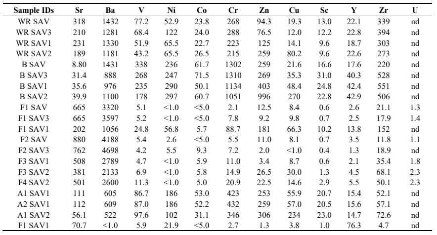The behavior of the constitutive elements from feldspars is more difficult to delineate, probably because the obtained separates do not strictly represent pure mineral fractions, depending rather on the global density of the crystals relative to the used dense liquids. This means, in turn, that most selected feldspar fractions, for instance, are probably mixtures of more or less pristine with more or less weathered crystals. However, based on the Na, K and Ca contents, most feldspar separates are of the microcline type and only the fraction F5 of sample SAV1 seems to be of a plagioclase type. The K