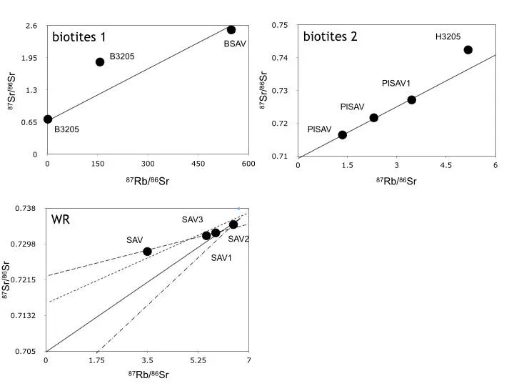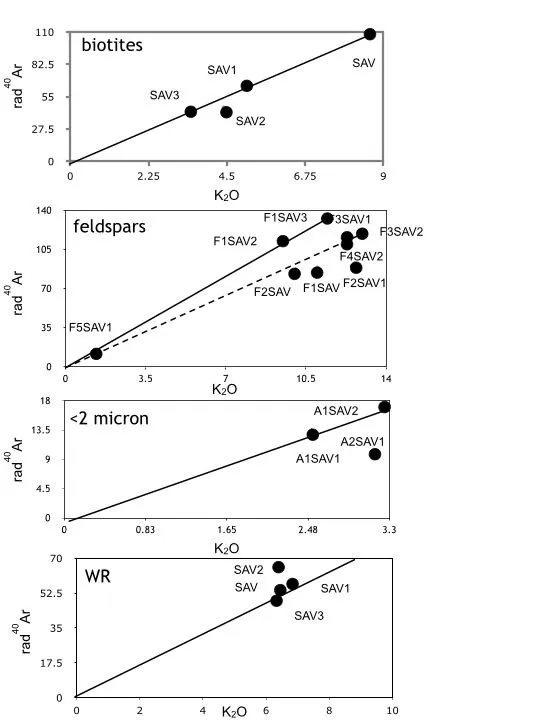 The K-Ar system of the SAV, SAV1 and SAV3 biotites outlines equivalent contents for both the K and radiogenic