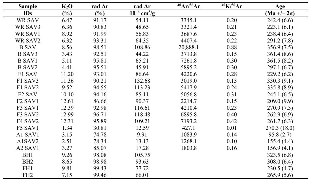 40Ar, as the data points plot along a line crossing the two coordinates at their initials, while those of SAV2 plot below (; ). It is, therefore, probable that the three biotite separates with their data points on the line crossing the two coordinates at their origins are fresh and that their average K-Ar age of 366.9 ± 2.7 Ma is at or close to the emplacement time of the granitic massif. It can also be stated that the biotite SAV2 located below this line of equivalent contents has been altered. The data of the feldspars are more dispersed than those of the biotite extracts, probably due to the previously mentioned separation problems. The highest values obtained are for F1 of the SAV3 and F1 of the SAV2 fraction average of 333.0 ± 2.7 Ma (), slightly below the average age of the biotite separates. Even lower values were obtained for the separate F1 of the rock SAV and F2 of SAV1 at 229–209 Ma. Two other feldspar fractions yield K-Ar data slightly higher, at 245.1 ± 6.5 Ma for F2 of the SAV sample. A last set of feldspar separates, including F3 of SAV1, F3 of SAV3, F4 of SAV2 and F5 of SAV1 provide an intermediate average age value of 266.5 ± 4.4 Ma. The combined K-Ar data of the fine A1 separate of SAV and the same A2 separate of the SAV1 sample, plot on a line intersecting the origin of the two coordinates with a data of 156.1 ± 0.7 Ma (). The third A1 fraction smaller than 2 microns of sample SAV1 plots below that line and yields even younger age data.