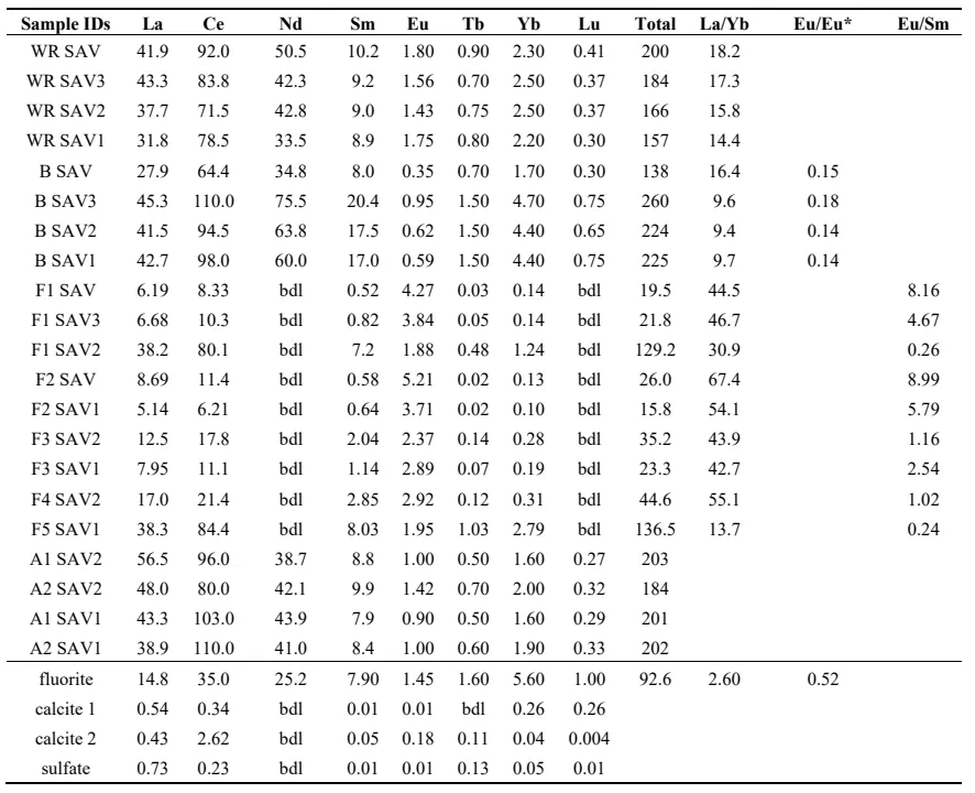. Contents in ug/g of the rare-earth elements from minerals, size fractions and whole rocks of the Plombières granite. IDs stands for identities, WR for whole rock, B for biotite, F for feldspar and A for <2 micron fractions; bdl means below detection limit and Eu* means Eu reference content The fluorite, calcite and sulfate at the bottom of the table are from nearby Plombières granites.