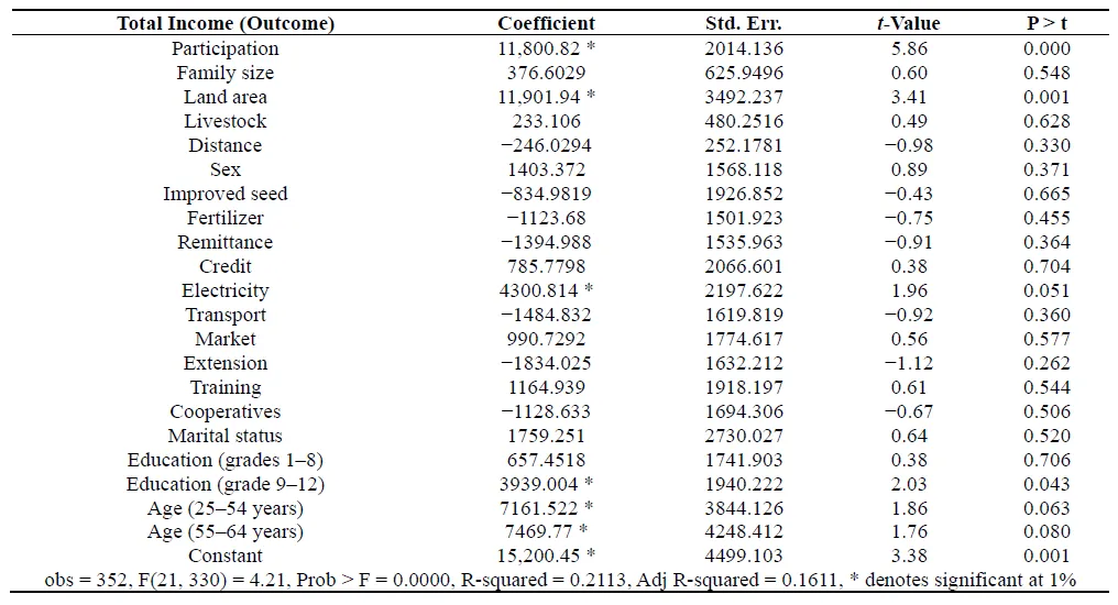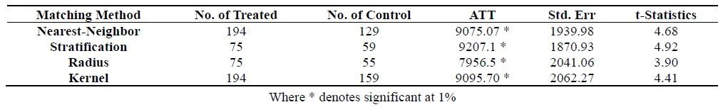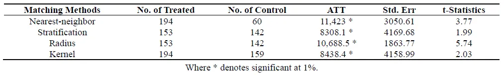 31] showed PSM constructs statistical comparison groups based on the probability of participation in treatment conditional on observed characteristics. There are two assumptions of PSM, conditional independence and common support assumption. The former assumes matching methods can used only to construct observed characteristics of the comparison group. The latter assumes the treatment units must be comparable to non-treatment units in terms of observed characteristics. The parameter of interest in propensity score is the Average Treatment effect on the treated (ATT) because it the participation impact on household livelihood outcome. The nearest neighbor, caliper, radius, and kernel matching were employed to estimate the impact of participation on household livelihood outcomes. The propensity score P(