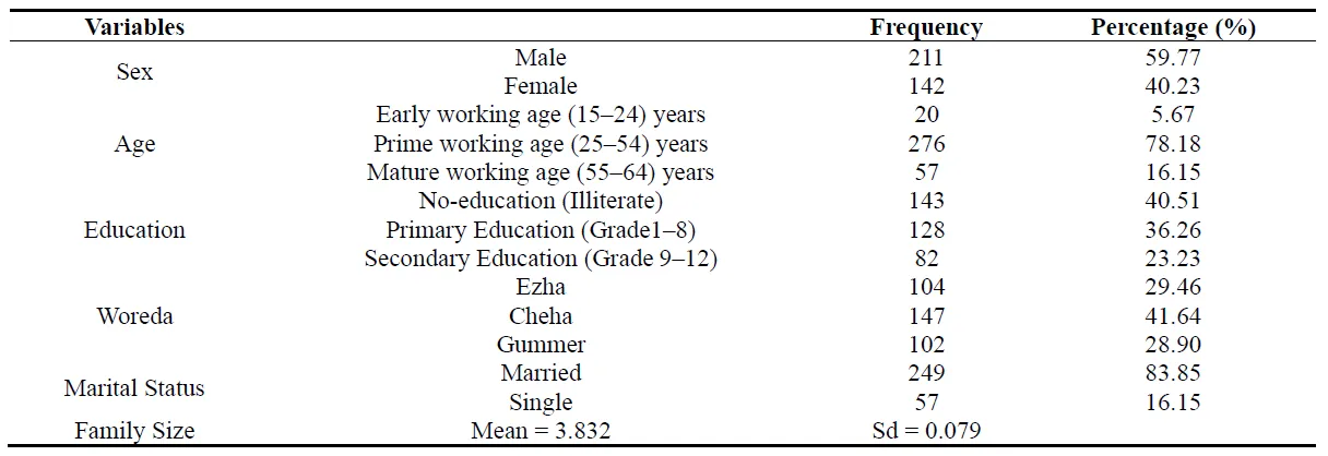 From the total 400 questionnaires distributed, only 352 (88%) were filled appropriately and returned, whereas the remaining 12% were lost and filled inappropriately. shows 59.77% of the respondents were male, while 40.23% were female. The prime and mature working age groups accounted for 78.18% and 16.15% of total respondents, respectively, while early working age accounted for 5.67%. The result indicated that most respondents are at their mid-year of active working age. Respondents with no education accounted for 40.51%, while 36.26% and 23.23% of respondents have attained primary and secondary education, respectively. The majority (41.64%) of the respondents were located in Cheha Woreda, while 29.46% and 28.90% were residents of Ezha and Gummer Woreda, respectively. Most (83.85%) respondents were married, while 16.15% were single-headed households. The average family size is 3.83, per household, which is less than the national average household size of 4.8.