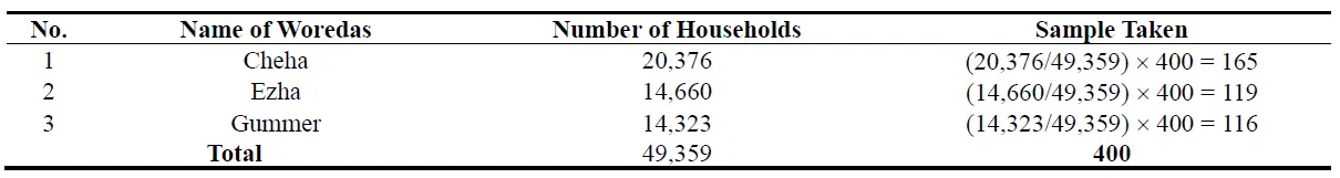 1 Data were collected from primary and secondary sources. The former includes data collected from sample households, interviews, and focus group discussions (FGD), while the latter was collected from national, regional, zonal, and Woreda reports. The study employed probability and non-probability sampling techniques. Data collected through questionnaires employed stage sampling. In the first stage, three Woredas were randomly selected: Ezha, Cheha, and Gummer. In the second stage, sample households were selected randomly from the three Woredas. According to the [