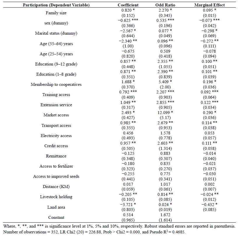 14] also exhibited that age, household size, primary occupation, farm income, farming experience, membership to cooperatives, and access to credit significantly affect women farmers to partake in nonfarm enterprise. Married households and households with better education, large family size, and high annual income, land, livestock, access to irrigation, and credit, female and young, are more likely to partake in NFEA [