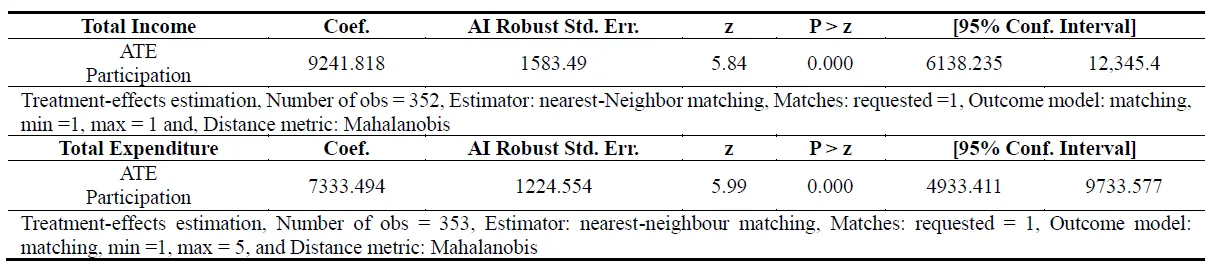 The impact of NFEA on household livelihood outcomes is shown by using PSM. Income and expenditure are proxies of livelihood. Ref. [
