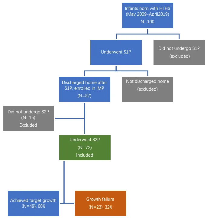 shows the flow diagram of the patients included in the study. From May 2009 to April 2019, 100 patients with HLHS were admitted to our hospital. Eighty-seven patients were discharged after S1P and enrolled in our IMP. Of these, 15 patients did not undergo S2P at our institute due to death, heart transplant, or transfer of care to another center.
