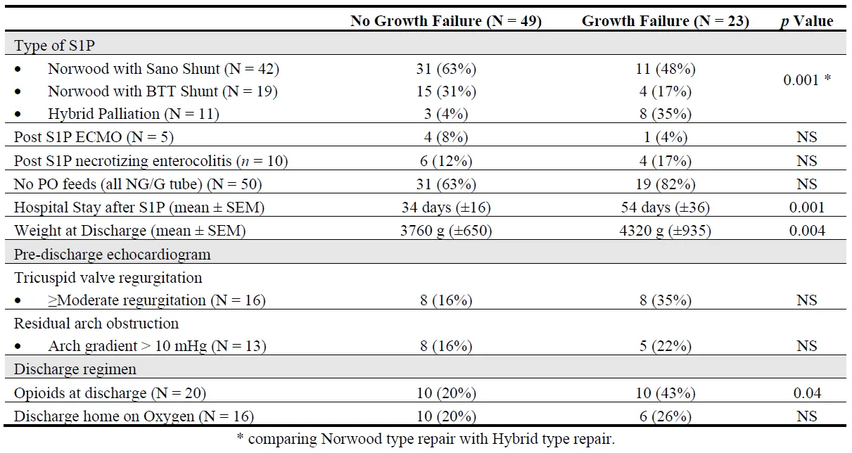 highlights the potential risk factors related to S1P which influenced the rate of somatic growth during interstage. Patients who suffered growth failure were significantly more likely to have undergone “Hybrid type of repair, consisting of pulmonary artery banding and patent ductus arteriosus stenting” as their initial procedure instead of Norwood type procedure (