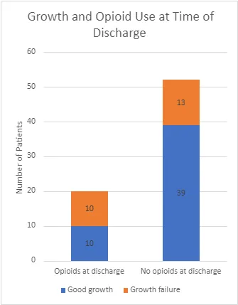 . Influence of Opioid use at time of discharge on growth failure. Image description: Growth failure was more common among the patients who were discharged home on opioids vs those who were not (50% vs 25%), <i>p</i> = 0.04.