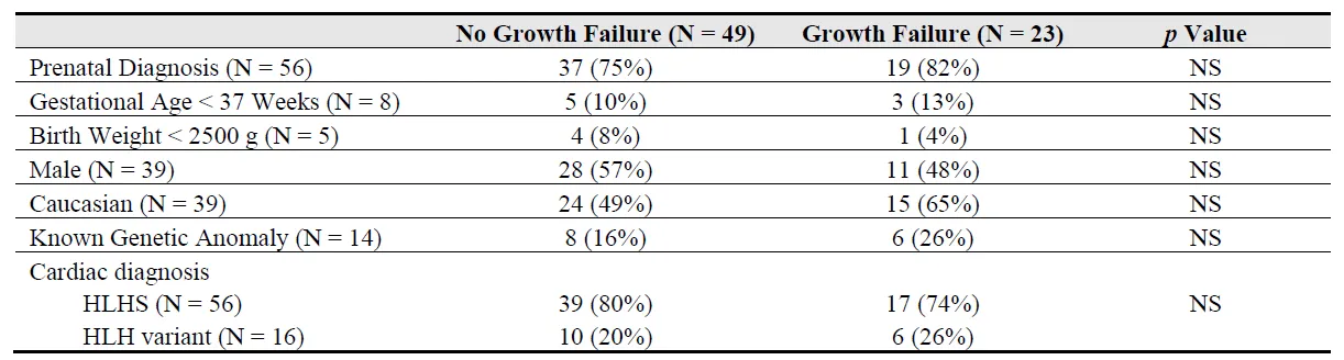 . Clinical characteristics related to interstage growth in study subjects (N = 72). NS means not-significant.