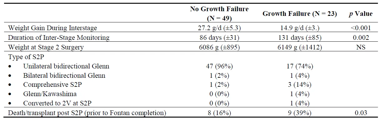 compares the clinical effects of growth failure on the study subjects. It is our center’s preference to perform the S2P between 4–6 months of age, and after achieving a weight gain of about 6 kg. It was noted that to achieve this target weight, patients with growth failure required a much longer duration of interstage monitoring (131 days vs 86 days). Most patients underwent unilateral, bidirectional Glenn procedure as their S2P. A total of 11 patients had undergone Hybrid repair in our study; and of these 7 patients underwent a separate PA de-banding and Norwood procedure, followed by Glenn surgery at a later stage. The remaining 4 patients underwent a comprehensive S2P consisting of a combined Norwood type arch repair and Glenn procedure. Majority of patients (84%) who achieved adequate interstage growth survived to S3P (Fontan) surgery, compared to only 61% who suffered from growth failure. A significantly larger proportion (39%) of patients with growth failure died or required a heart transplant following S2P (