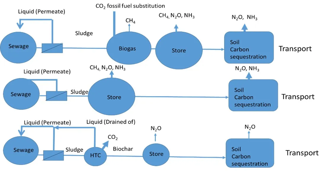 The HTC is a technologically simple sludge treatment that could lower the cost for dewatering dairy sludge, forming a biochar like material known as a hydrochar. That can be applied to land, for the purpose of carbon sequestration, P and N recycling. In this work, HTC is compared to two alternative sludge handling strategies; (i) whereby sludge is stored, transported to a field and then directly applied to land, and (ii) sludge is co-digested in AD and its digestate is applied to land. Our calculations indicate that GHG balances of HTC sludge management sequesters 63.4 kg CO2eq per ton sludge, and by contrast standard sludge management emits 420 kg CO2eq per ton sludge, and AD treatment 156 kg CO2eq per ton sludge. The HTC offers the greatest potential reduction in GHG emissions, primarily due to a reduction in predicted N2O emissions and a higher carbon stability of the biosolid. Without HTC, AD still offers considerable GHG reductions over direct application of the sludge to land. This is primarily due to AD reducing methane release during storage.