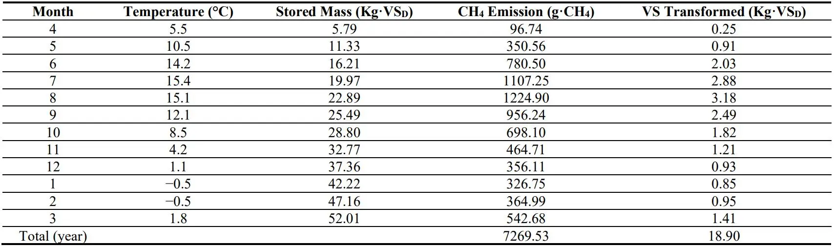 . Methane emissions arising during year-long storage of untreated dairy secondary sludge.