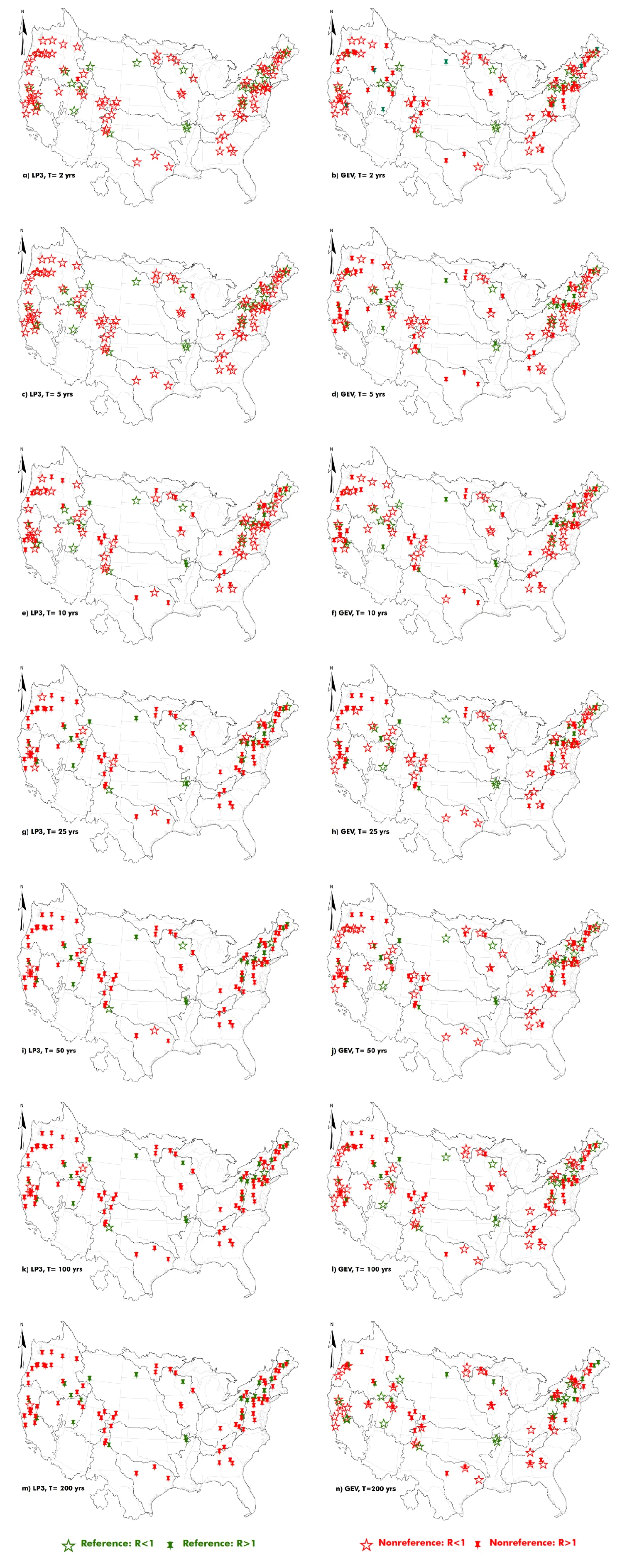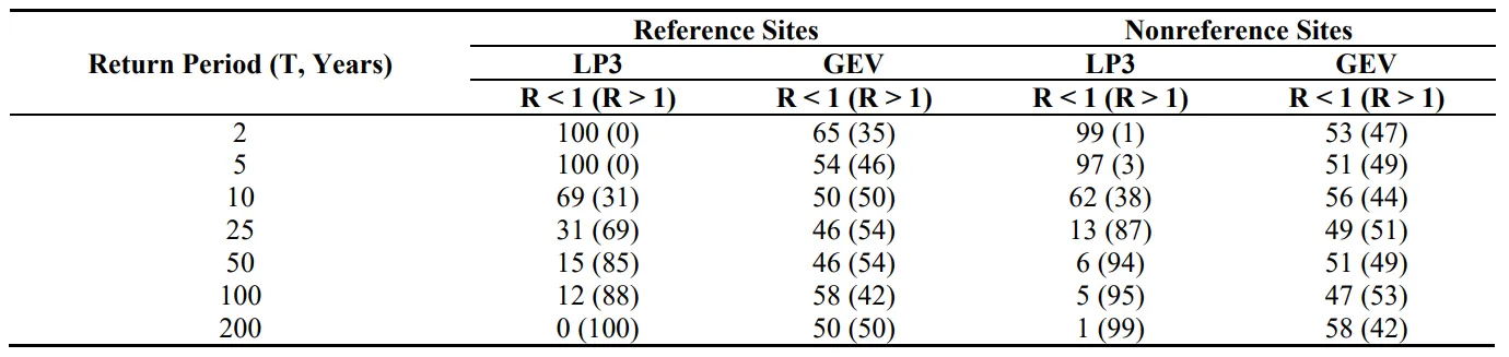 In this study, we considered two clusters of 26 reference and 78 nonreference sites with peak flow records of at least 100 years and no missing data across the contiguous US. We compared the differences between flood quantile estimates at reference sites with those at nonreference sites. We utilized two statistical distributions, Log Pearson Type III (LP3) and Generalized Extreme Value (GEV), to estimate flood quantiles. These robust, resistant, and efficient distributions have been tested extensively (e.g., [