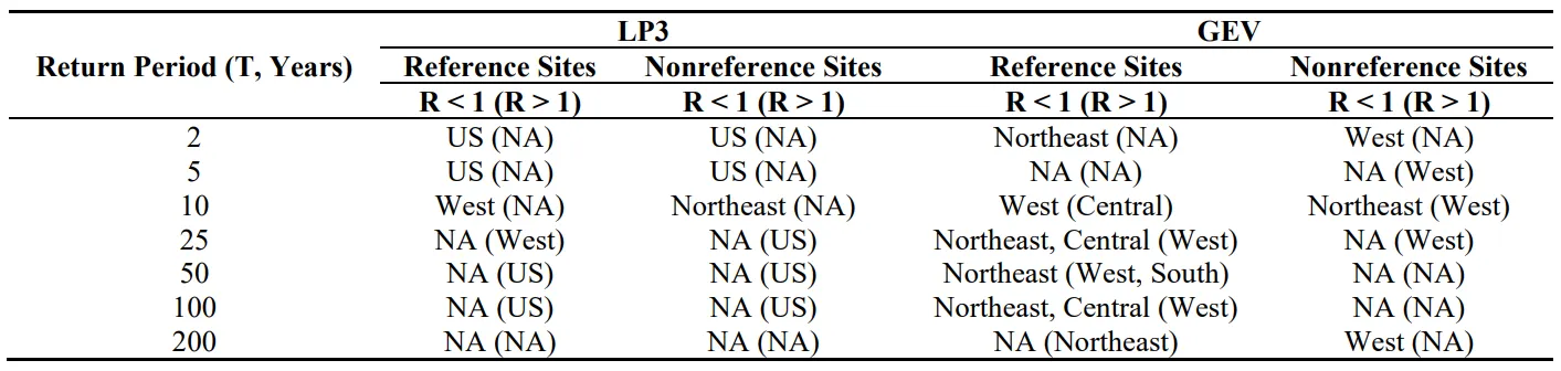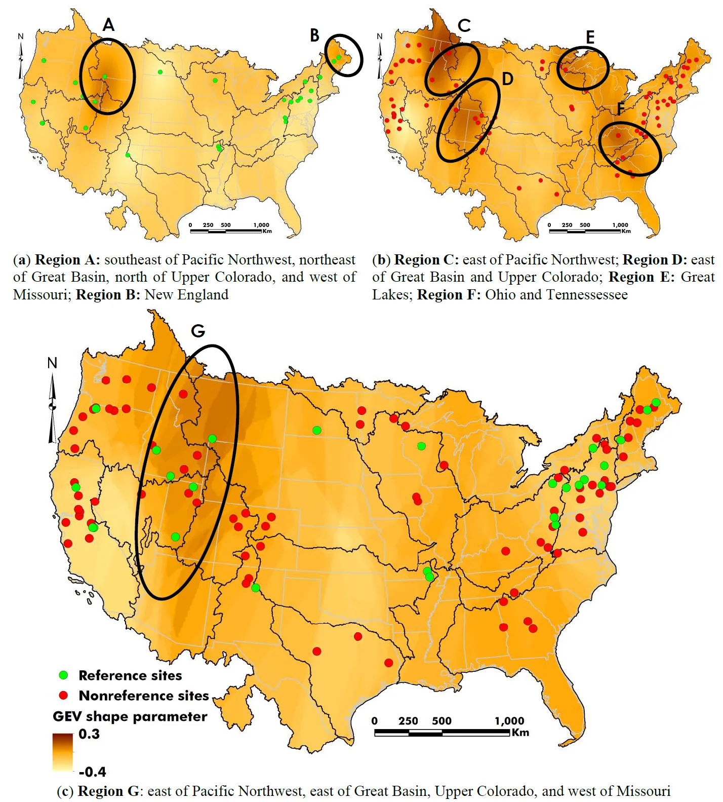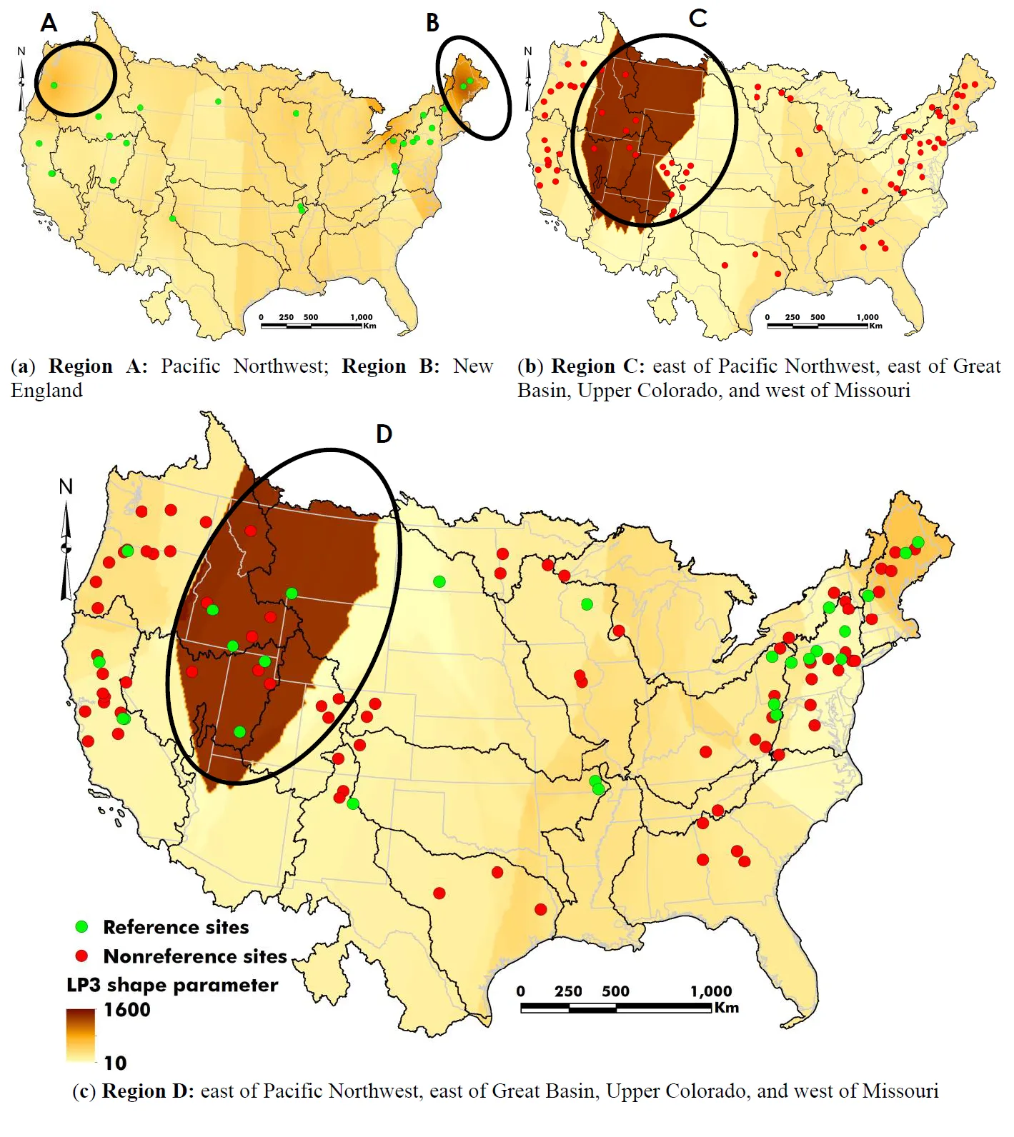 This article aims to: (1) investigate whether the choice of LP3 or GEV distribution is limited by a site being reference or nonreference, and (2) determine the impact of partitioning sites into reference and nonreference on estimating the shape parameters of LP3 and GEV distributions. These objectives were studied throughout the contiguous US using the most recent peak flow data to reassess the design flood information. The results can help engineers and water managers better prepared for changes in flood frequency and magnitude in nonstationary conditions and improve infrastructure design and reservoir management.