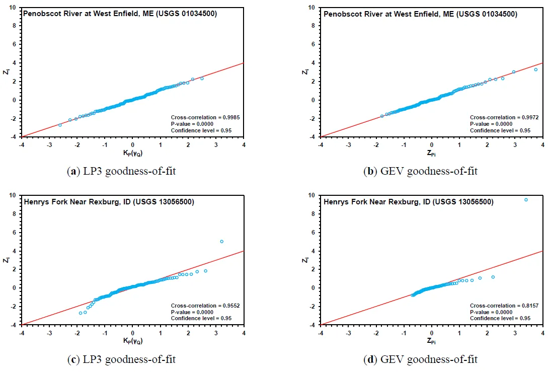 49]. The GEV produces less biased flood quantile estimations compared to LP3 [