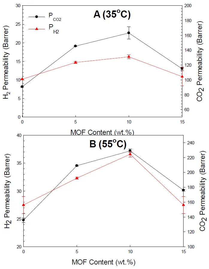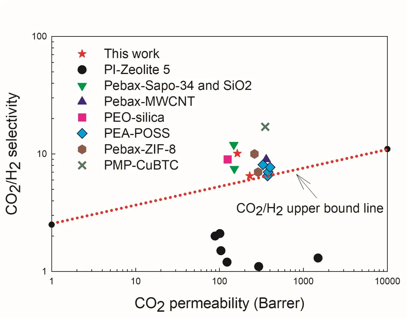 2 selectivity due to higher free volume. However, the performance declined at higher contents as the polymer chains became more rigid. The best CO