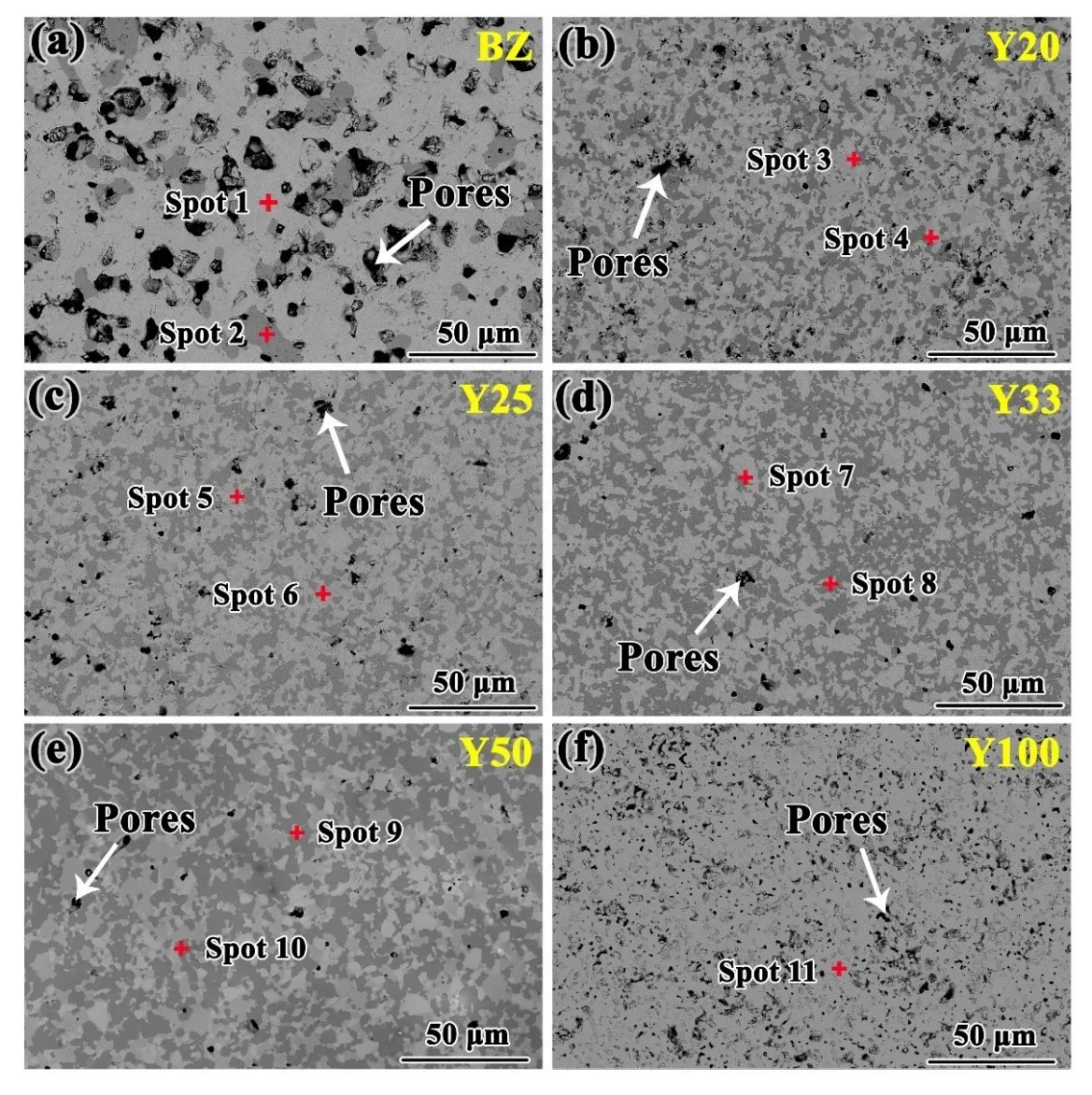 3 two-phase crucibles had a certain advantage in comparison with the pure BZ and Y100 crucibles. In particular, the Y50 crucible exhibited the best erosion resistance. In the following, the Y50 crucible was taken as an example to explore the mechanism by which it effectively prevents the erosion of alloy melts. With the addition of Y