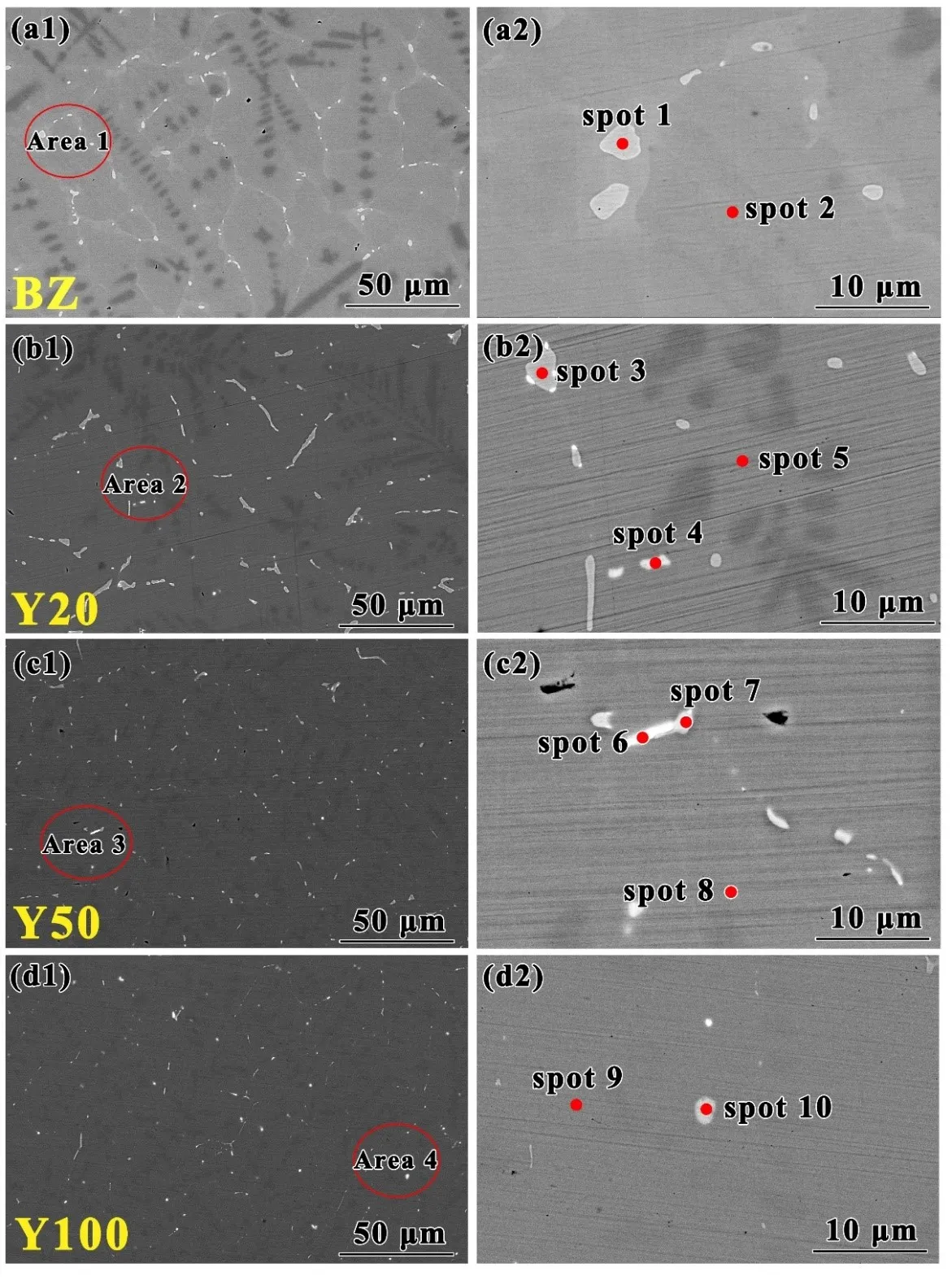 shows the microstructure of alloys for the third melting in BZ, Y20, Y50, and Y100 crucibles. From (a1,a2), the alloy cooled in the BZ crucible contains some gray particles. Combined with EDS results in (spots 1–2), the alloy matrix was Ti