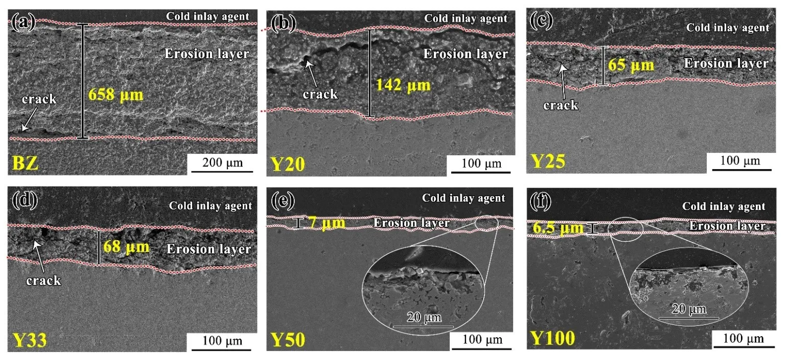 3 crucible, the thickness of the erosion layer was further decreased. For Y25~Y50 crucibles (c–e), it ranged from 65 to 7 μm. However, for the Y100 crucible (f), the thickness of the erosion layer was only 6.5 μm.