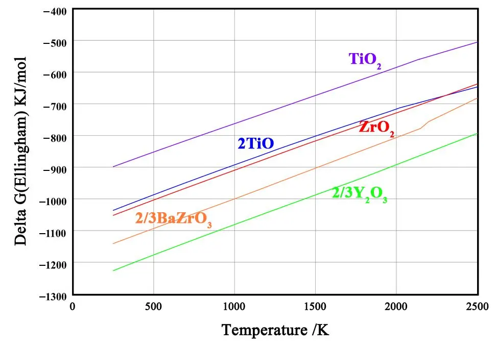 . Gibbs free energy of formation of TiO<sub>2</sub>, TiO, ZrO<sub>2</sub>, BaZrO<sub>3</sub> and Y<sub>2</sub>O<sub>3</sub>.