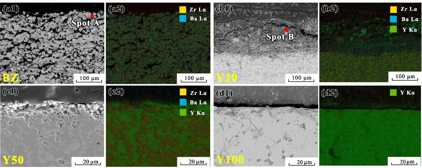 The magnified pictures of the erosion layers of BZ, Y20, Y50, and Y100 crucibles are shown in . From (a1), it can be seen that the erosion layer of BZ crucible exhibited a clear layered structure, which showed a loose and porous phenomenon. The corresponding mapping analysis indicated that only Ba and Zr elements exist in the erosion layer, and there is no residue of alloy melts, as shown in (a2). In addition, the EDS result of spot A () showed that BaO phase was observed. In our previous studies [