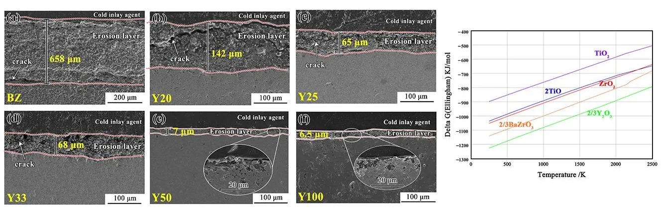 2Ni alloys. As shown in a, the internal structure of the BZ crucible was damaged due to the infiltration of alloy melts. The generated thickness of the erosion layer was about 658 μm. For the Y20 crucible, the thickness of the erosion layer had a significant decrease to 142 μm, as shown in b. As the increase of Y