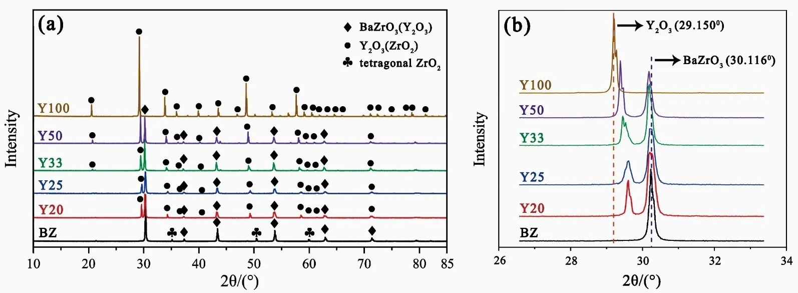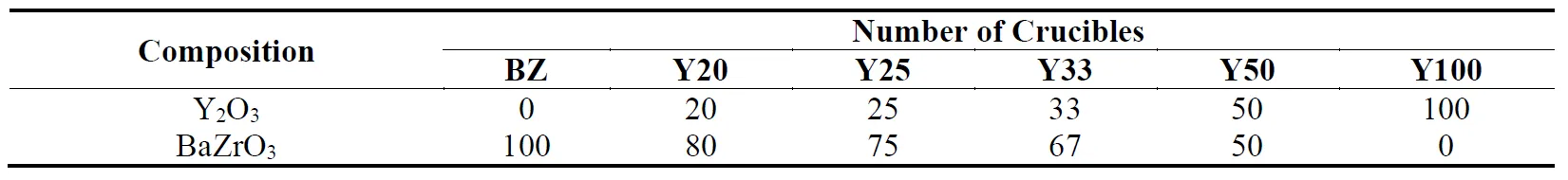 shows the XRD patterns of BZ~Y100 crucibles after sintering. As can be seen in a, the BZ crucible consisted of cubic BaZrO