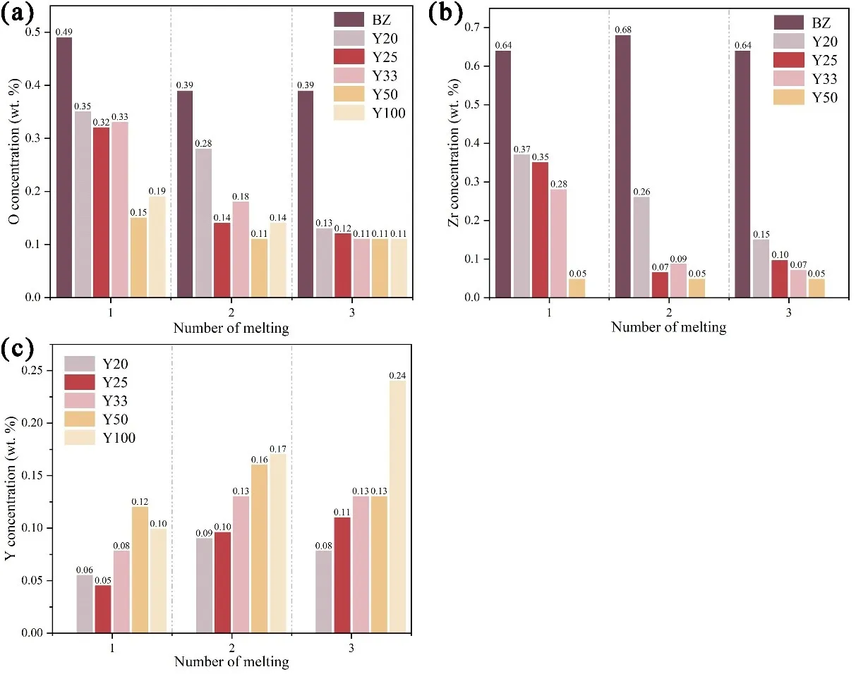 2Ni alloys using BZ~Y100 crucibles as well as the O, Zr, and Y element concentrations in each alloy. a shows the change trend of O concentration. It can be seen that the O concentration exhibited a decreasing trend as the increase of melting number regardless of the type of crucibles. However, it was more obvious that the BaZrO