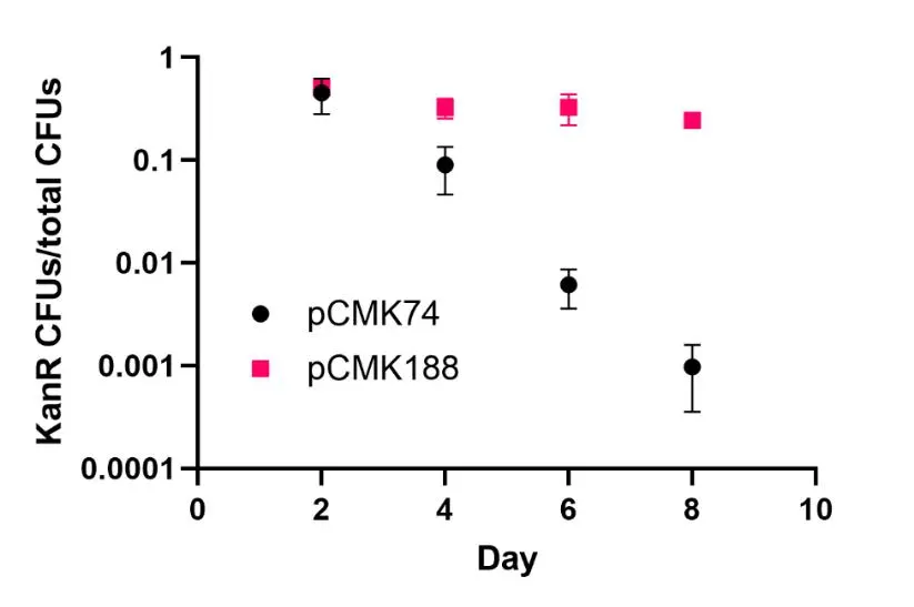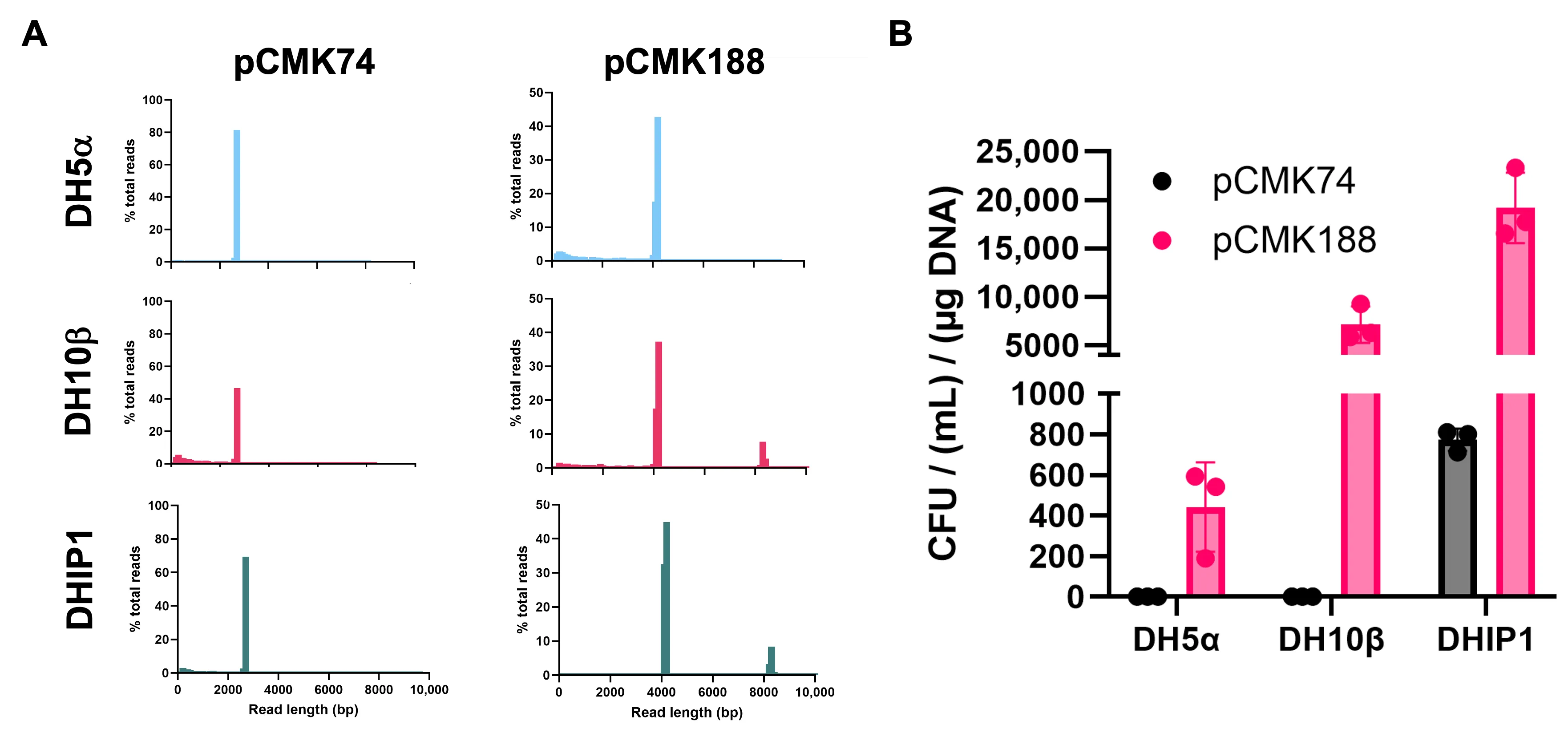 24]. As necessary, plasmids were sequenced via Oxford nanopore sequencing (Plasmidsaurus) to confirm sequence identity and determine their multimer content. Plasmids pCMK74, pCMK191, pCMK139, and pCMK188 have been submitted to and made available via Addgene.