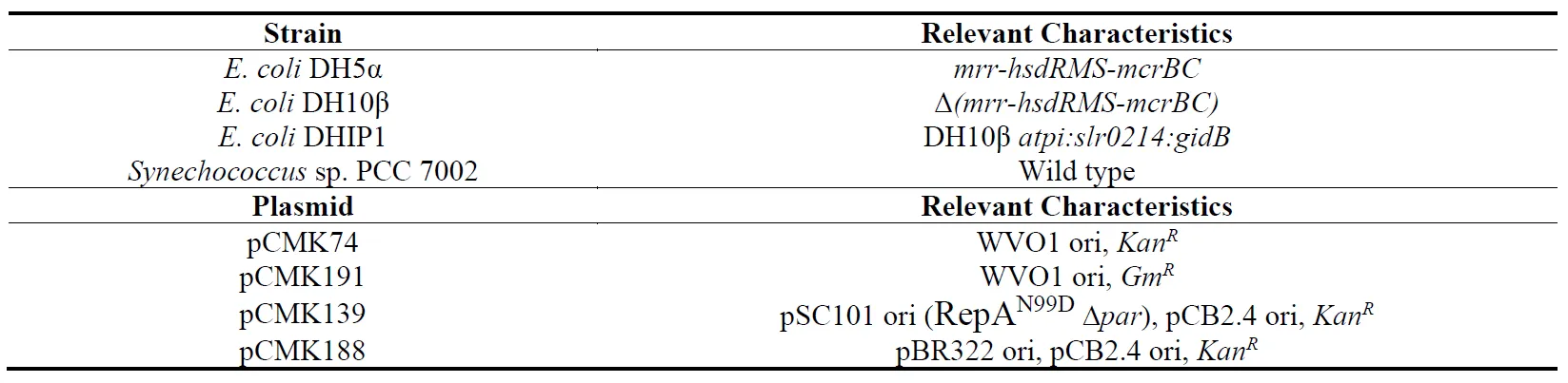 1]. This can be problematic since the ability to fully knock out a gene or stably insert one requires complete chromosomal segregation. This typically requires a lengthy process of repeated restreaking on plates with increasing antibiotic concentrations; an especially arduous task if the resulting edit is deleterious to strain fitness. Although this requirement could be bypassed via the use of replicating episomal plasmids, to date, the only broad host range plasmids shown to replicate in PCC 7002 include RSF1010 [
