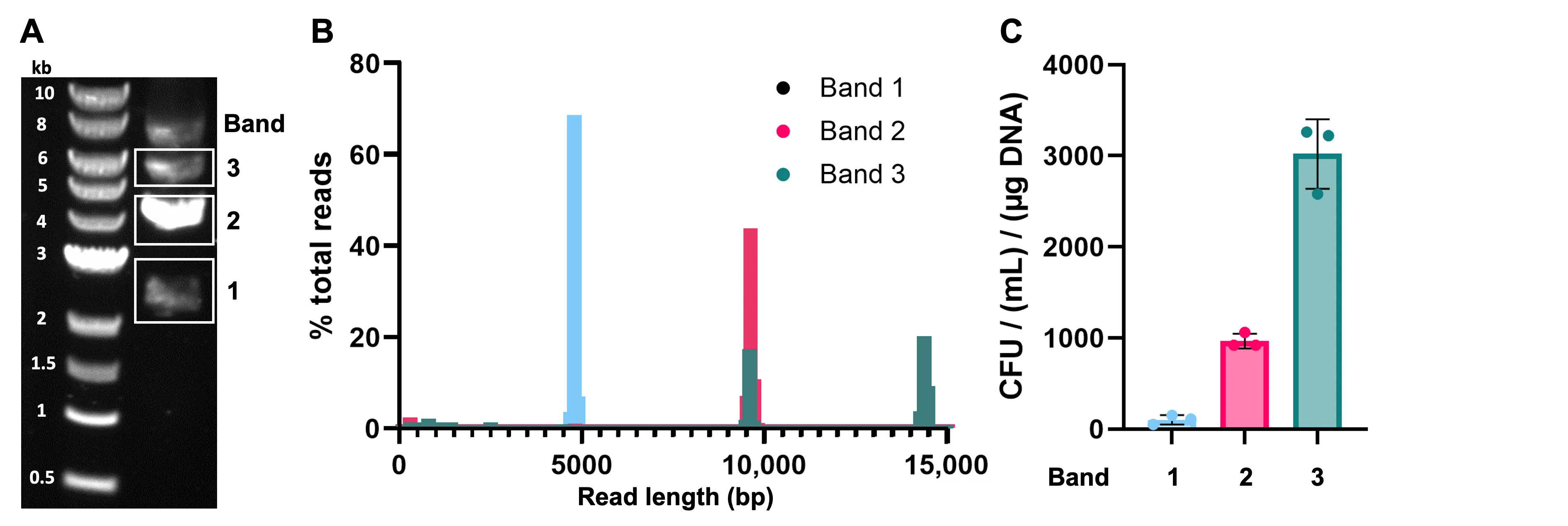 Plasmid samples enriched with differently sized multimers were resolved from miniprepped samples via gel electrophoresis (0.5% agarose) followed by extraction of individual bands using the QIAquick Gel Extraction Kit (Qiagen, Germantown, MD, USA) and DNA Clean & Concentrator Kit (Zymo Research, Irvine, CA, USA). Each isolated fraction was then analyzed via Nanopore sequencing (Plasmidsaurus, San Francisco, CA, USA) to determine the size and distribution of included plasmid multimers, if any.