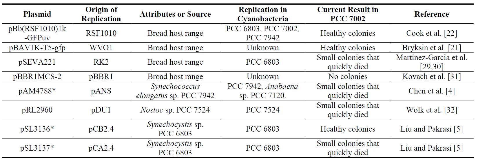 21] that, to our knowledge, has not previously been investigated in cyanobacteria. Meanwhile, pCB2.4 is derived from PCC 6803 and has previously been used to create a shuttle vector for that strain [
