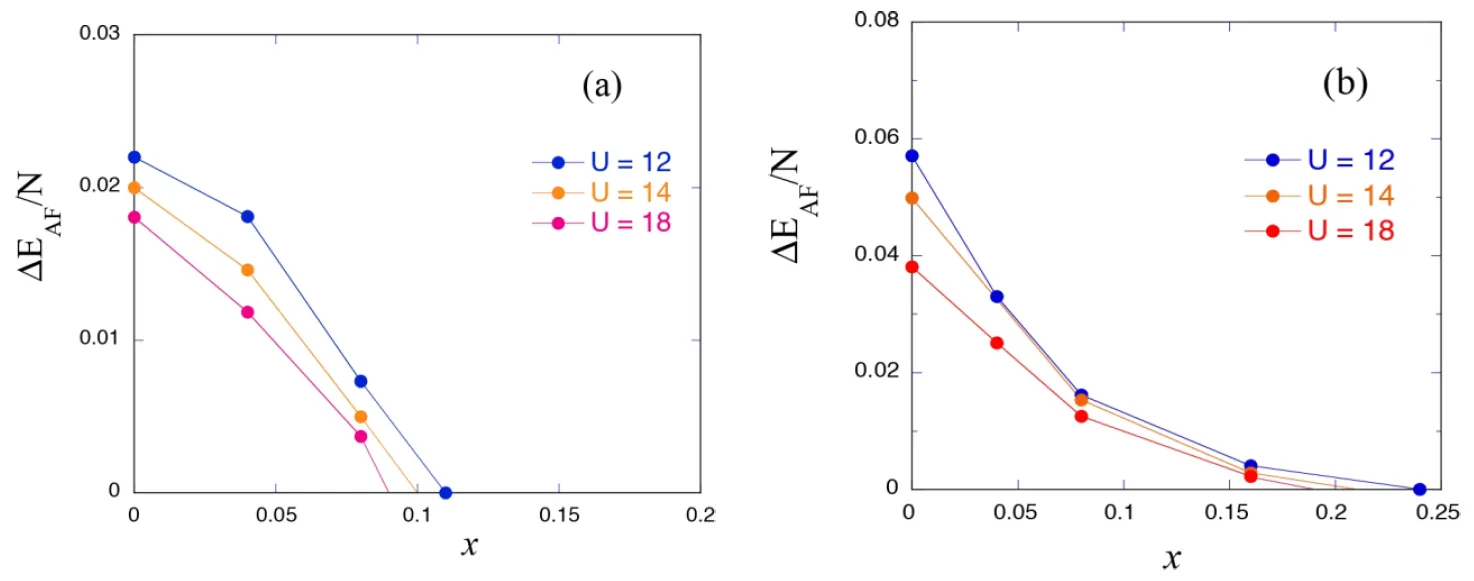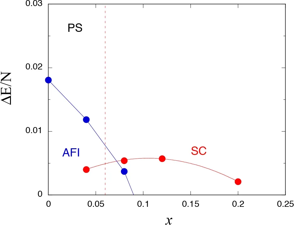 47]. These three parameters are important and give plentiful structures of the phase diagram that include the superconducting phase and the antiferromagnetic phase. The transfer $$\boldsymbol{t}^{\prime}$$ plays an essential role in determining the stability of magnetic states. For example, in the case where $$\boldsymbol{t}^{\prime}=\boldsymbol{0}$$, the antiferromagnetic state becomes unstable when holes are doped. The 2D Hubbard model is also useful to understand the appearance of inhomogeneous electronic states such as stripes [