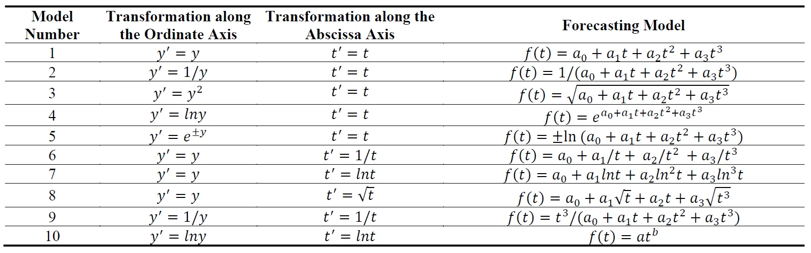 To obtain a variety of mathematical prediction models based on polynomials, various nonlinear monotonic transformations can be used along the abscissa (time) axis and the ordinate axis for the analyzed time series [