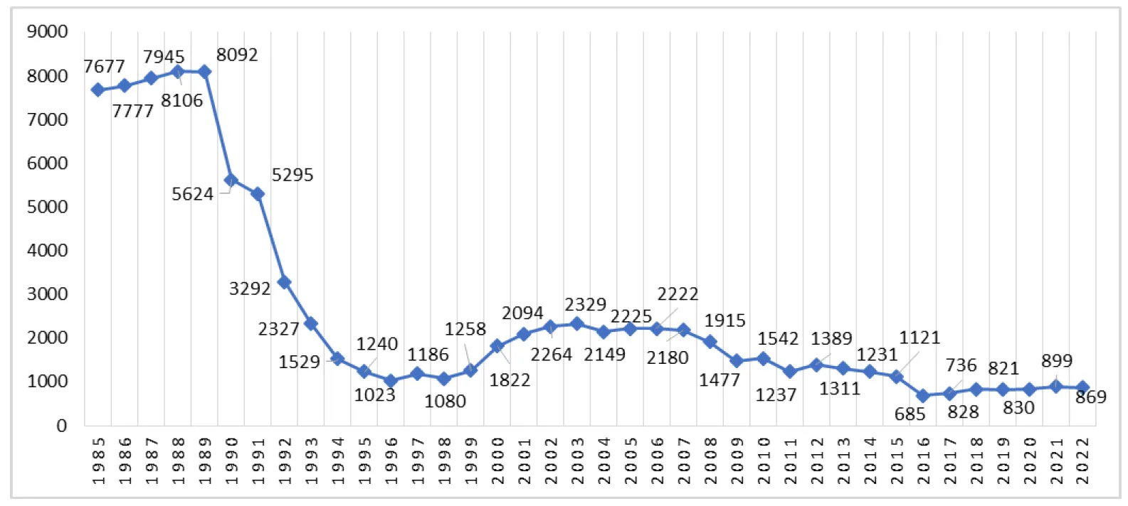 The purpose of the study is a detailed analysis of the production of the raw material base of textile industry enterprises, namely: cotton, linen, silk fabrics for the period 1985–2022 years on the territory of the USSR and the Russian Federation. Before the Soviet Union collapsed, the RSFSR had a well-developed production of cotton, linen, and silk fabrics.The USSR was one of the three most developed countries in the production of textile products.