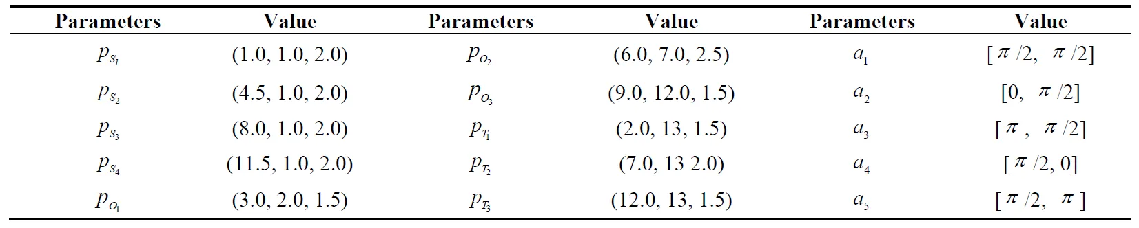 i-th S-UAV position, $$n_f(n_f\leq n_t)$$ denotes the number of target found, and $$a_i=\begin{pmatrix}\omega_i,\phi_i\end{pmatrix}$$ denotes the action selected, $$p_o=\begin{Bmatrix}p_1,p_2,...,p_{n_o}\end{Bmatrix}$$ denotes the position obstacles, which is shown as follows: