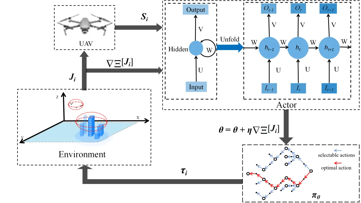 i-th S-UAV. Then, the actions are selected based on $$\varepsilon$$ and constitute the $$\pi_{_\theta}=p_{_\theta}(a_i\mid s_i)$$. Secondly, actions at each time step constitute $$\tau_{i}$$. Then Second, new policy network parameters are calculated based on the cumulative rewards. Finally, S-UAV will obtain a new $$\pi_{_\theta}=p_{_\theta}(a_{_i}\mid s_{_i})$$ based on the new $$\theta$$ and start a new cycle.