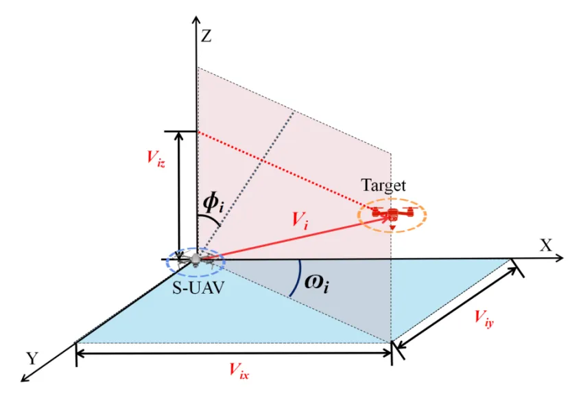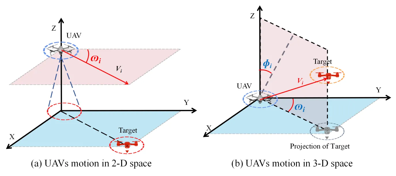 Without considering communication constraints, the UAV understands the environment by communicating with other UAVs in real time, and makes the best decisions based on the information. In most of the existing research, the motion of the UAV in 2D space is mainly affected by the yaw angle $$\omega_{i}$$. The velocity components of the UAV in the X-axis and Y-axis are changed by adjusting $$\omega_{i}$$. However, in 3D space, the motion of UAV in Z-axis needs to be achieved by the azimuth angle $$\phi_{i}$$. as shown in .