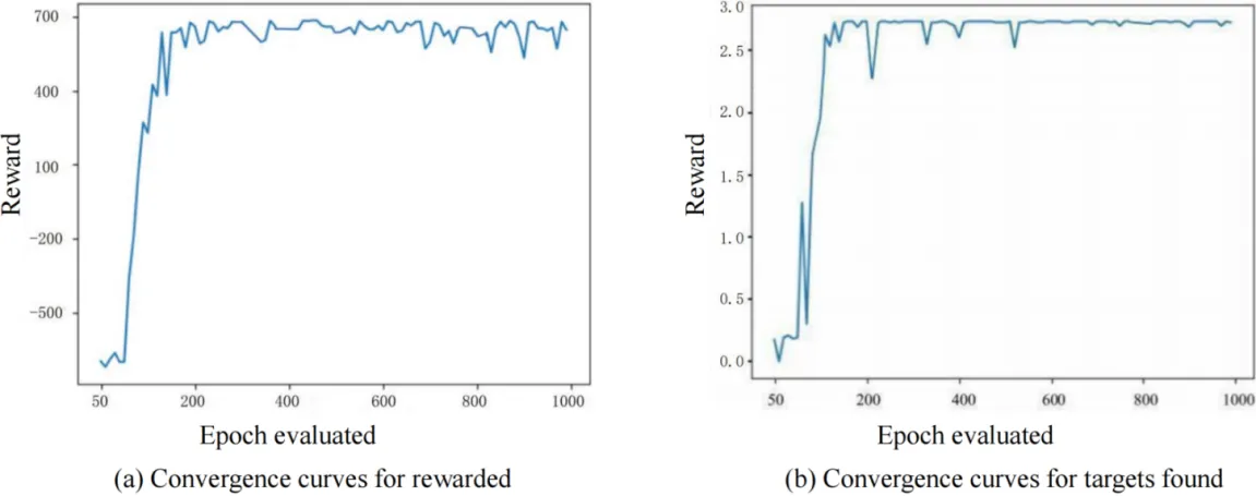 In the simulation, the algorithm evaluates the average cumulative reward and the average number of targets found per 100 epochs. The cumulative reward and the number of target finds generated by the S-UAV exploring the 3D environment are shown in .