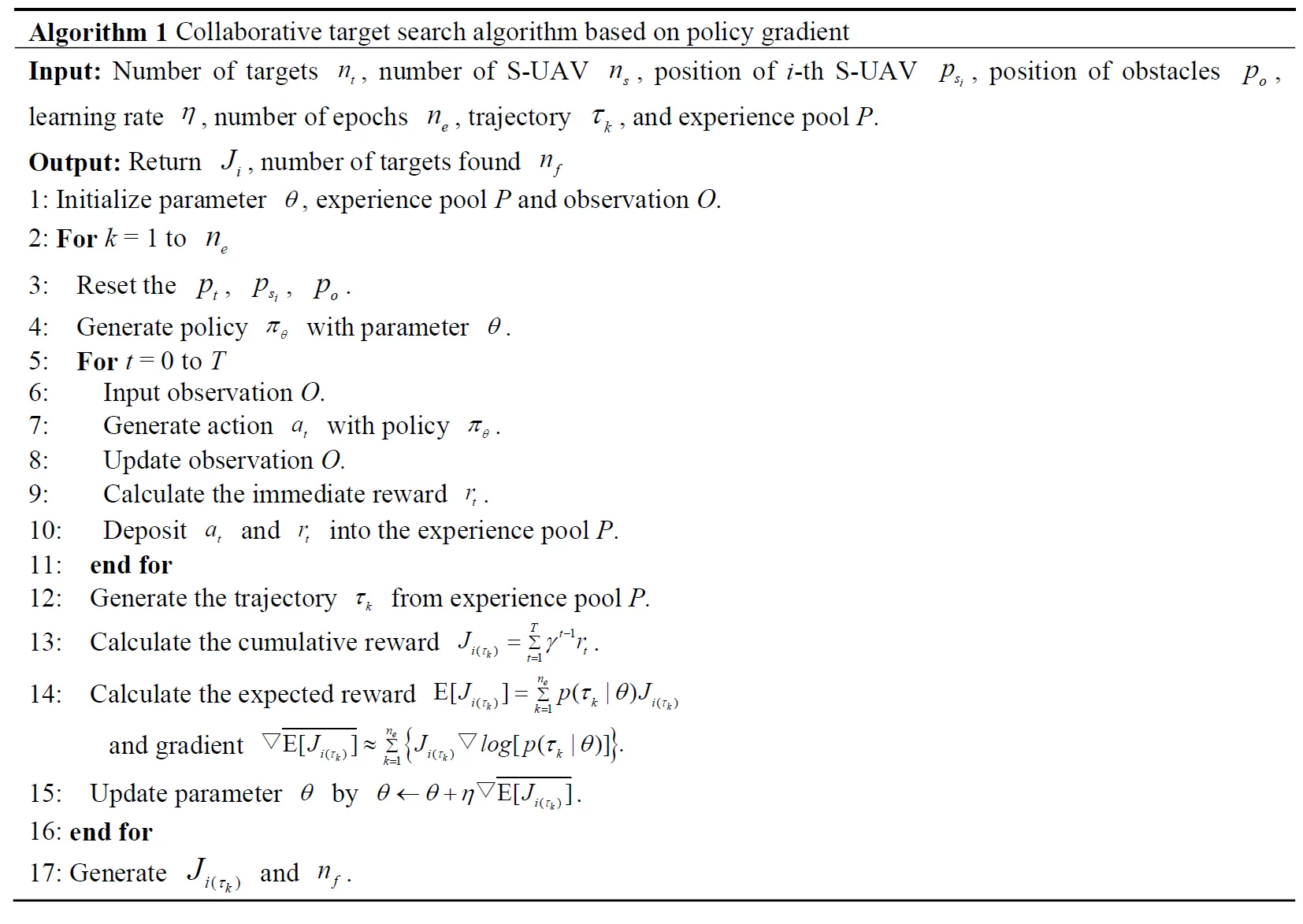 k = 1, the S-UAV searches for targets in the environment according to an initial policy $$\pi_{\theta}$$, then generates an initial trajectory $$\tau_{1}$$. Next, the cumulative reward $$J_{i(\tau_1)}$$ is obtained and deposited into the experience pool for updating the policy $$\pi_{\theta}$$ at