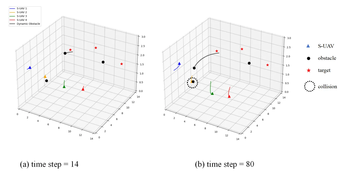 14], is unable to applied in 3D environment and hence cannot compare with the proposed method in this paper due to its lower dimensional space and information. Besides, the 3D space-based obstacle avoidance policy ignores the complexity of the algorithm. In order to validate the proposed 3D spatial target search method and obstacle avoidance method, shows the exploration process of the S-UAVs when the algorithm does not construct the reward functions corresponding to obstacle avoidance and collision respectively. From the results, we can see that when the time step is 80, we have $$D(p_{S_2},p_{O_2}) < d_s$$, but the S-UAV doesn’t obtain the corresponding reward feedback, as a result, the collision occurs.