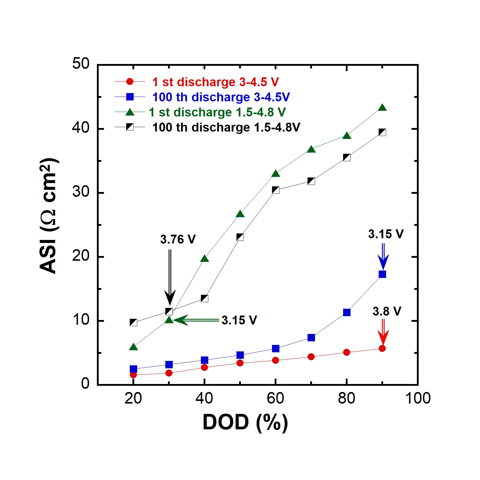 More information on the change in the overall cell potential as a function of the depth-of-discharge (DOD) can be obtained by evaluating the area-specific impedance (ASI) expressed in Ω cm