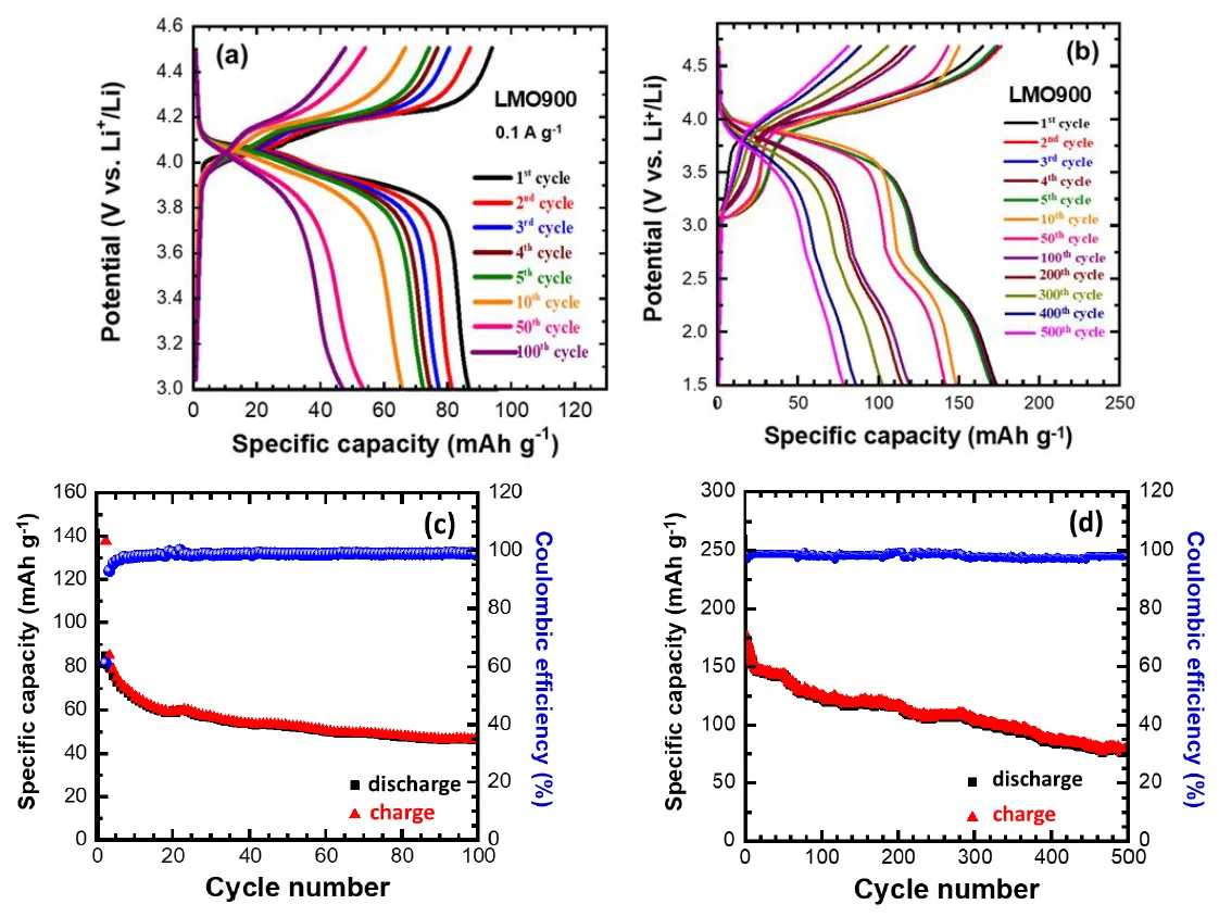 . (<b>a</b>,<b>b</b>) GCD profiles of the LMO900 electrode recorded in the potential range of (<b>a</b>) 3.0–4.5 V for 100 cycles and (<b>b</b>) 1.5–4.8 V vs. Li<sup>+</sup>/Li for 500 cycles at current density of 100 mA g<sup>−1</sup> (0.7 C) (<b>c</b>,<b>d</b>) Cycleability and Coulombic efficiency of LMO900 cathode material in potential window (<b>a</b>) 3.0–4.5 V and (<b>b</b>) 1.5–4.8 V vs. Li<sup>+</sup>/Li under 100 mA g<sup>−1</sup> current density.