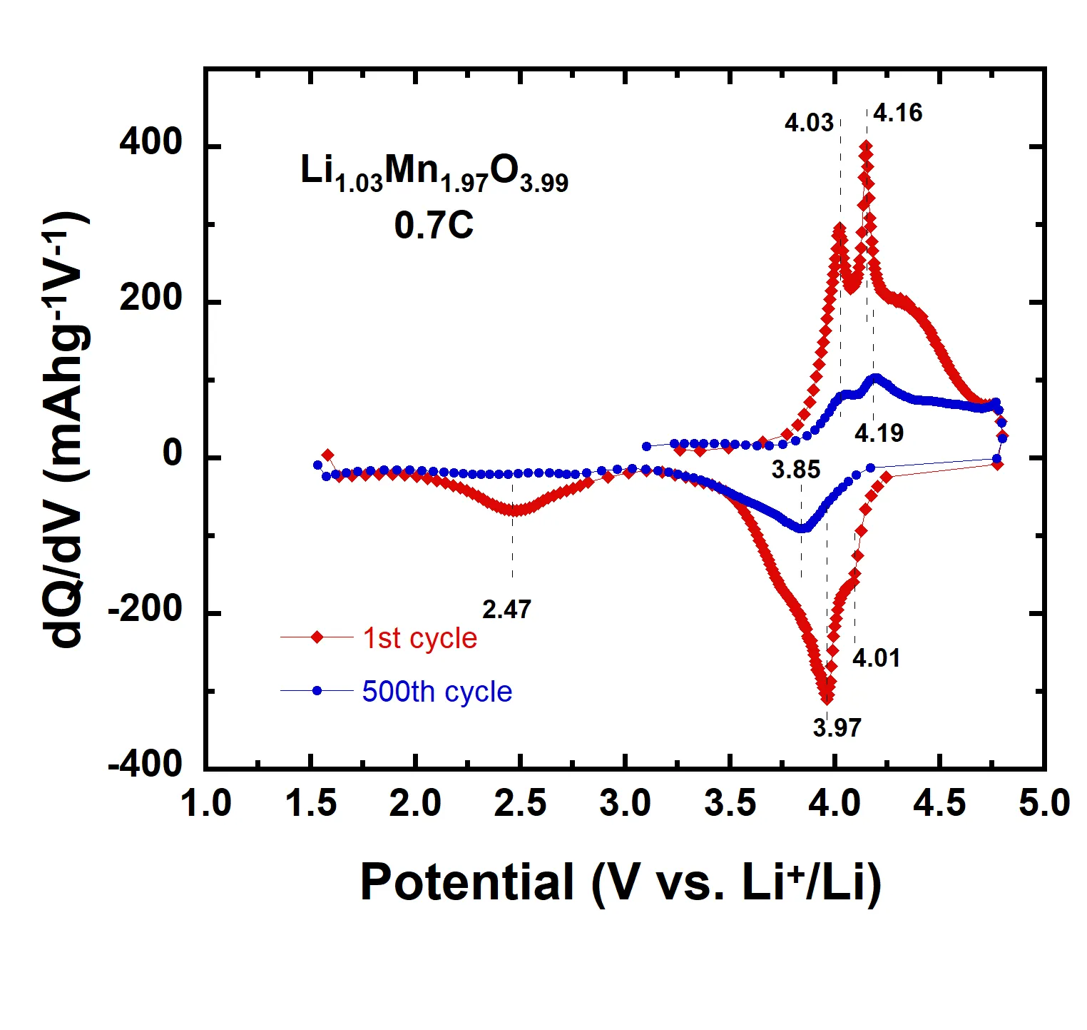 3+/3.5+, respectively. In the high potential region, two pairs of redox peaks correspond to the two undistinguished plateaus of b, indicating that lithium-ions were extracted and inserted into the spinel phase by a two-step process. The differential capacity plot at the charge stage had two sharp peaks at 4.03 and 4.16 V, and the discharge stage also showed two sharp peaks at 4.01 and 3.97 V. The peak potential at 2.47 V corresponds to the pseudoplateau arising from the insertion of Li ions into the spinel 16c sites. Regarding the differential capacity after 500 cycles, all redox peaks maintain the same potential position; only their intensity decreases throughout cycling due to the capacity decay of the LMO electrode. The peak potential difference remains unchanged after 500 cycles, indicating the good electrochemical stability of this Li-rich electrode, in which doping mitigates the fading mechanisms. Therefore, the differential capacity analysis clearly shows that introducing excess Li in LiMn