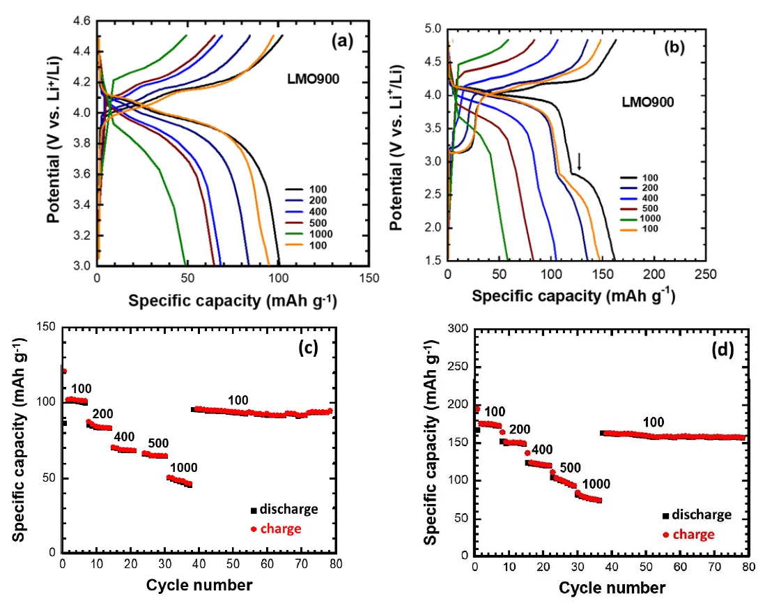 −1) are depicted in a,b. Even at high rates, the 4-volt plateaus remain recognizable. The GCD profiles of the spinel electrode cycled in the wide potential range show a remarkable phenomenon: the reduction of the plateau related to the tetragonal phase at 2.8 V (marked with an arrow in b) until it disappears with increasing current density. This finding is attributed to the tetragonal phase behaving like a cubic phase under high current density conditions. c shows the rate capability of the LMO900 electrode tested in the narrow potential range of 3.0–4.5 V. The discharge capacity values decrease with increasing C-rates in the sequence 85, 52, 35, 30, and 15 mAh g
