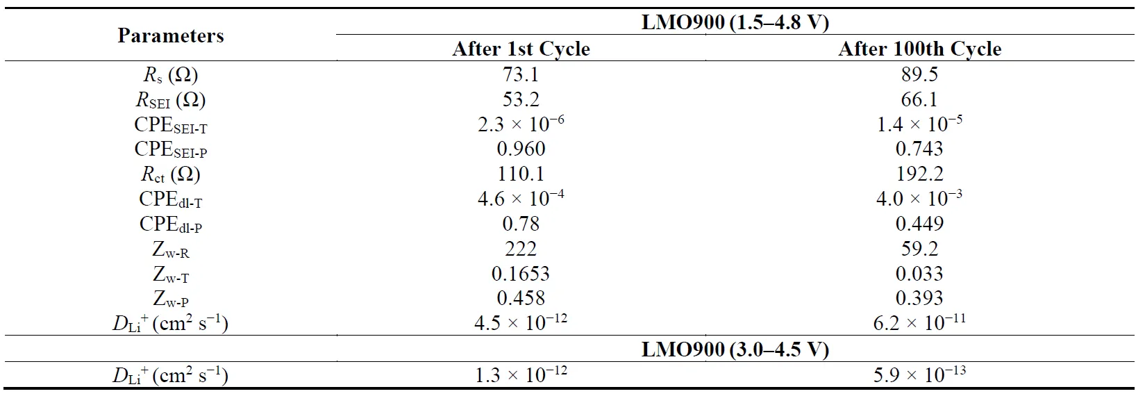 + ion kinetics of electrodes (). EIS measurements of LMO900 were carried out for the fresh electrode and after the 100th cycle for the voltage window 3.0–4.5. Additionally, measurements were performed after the 1st and 100th cycle for the voltage window 1.5–4.8 V, recorded at a rate of 0.7 C. a,b show the Nyquist plots for 1.5–4.8 and 3.0–4.5 V, respectively. The equivalent circuit model used to analyze the EIS patterns (e) is composed of four series components: the ohmic resistance of the cell (