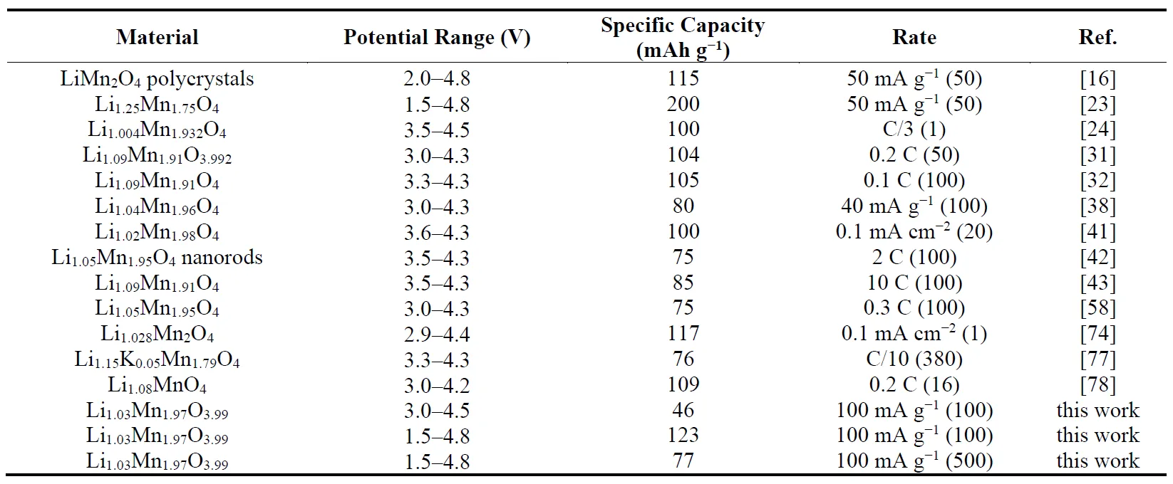 4 still faces challenges, particularly in terms of cycle stability and discharge-specific capacity, especially at high temperatures. These limitations can hinder its large-scale application, particularly in demanding conditions. Improving the overall performance and durability of LiMn