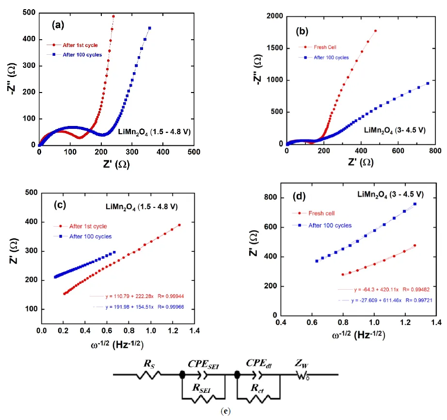 . EIS measurements of LMO900 electrode (<b>a</b>) Nyquist plot after 1st and 100th cycle at 0.7 C rate, in the potential window 1.5–4.8 V. (<b>b</b>) Nyquist plot for fresh and after 100th cycle at 0.7 C rate, in the potential window 3.0–4.5 V. (<b>c</b>) Plots of the real part of the impedance vs. ω<sup>−1/2</sup> for the LMO900 electrode after 1st and 100th cycle, in the potential window 1.5–4.8 V. (<b>d</b>) Plots of the real part of the impedance vs. ω<sup>−1/2</sup> for LMO900 electrode for fresh and after 100th cycle, in the potential window 3.0–4.5 V. Full lines are the slope of the <i>Z</i><sub>real</sub> vs. ω<sup>−1/2</sup> fits, providing the Warburg impedance. (<b>e</b>) Equivalent circuit used for the analysis of the −Z” vs. Z’ planes.