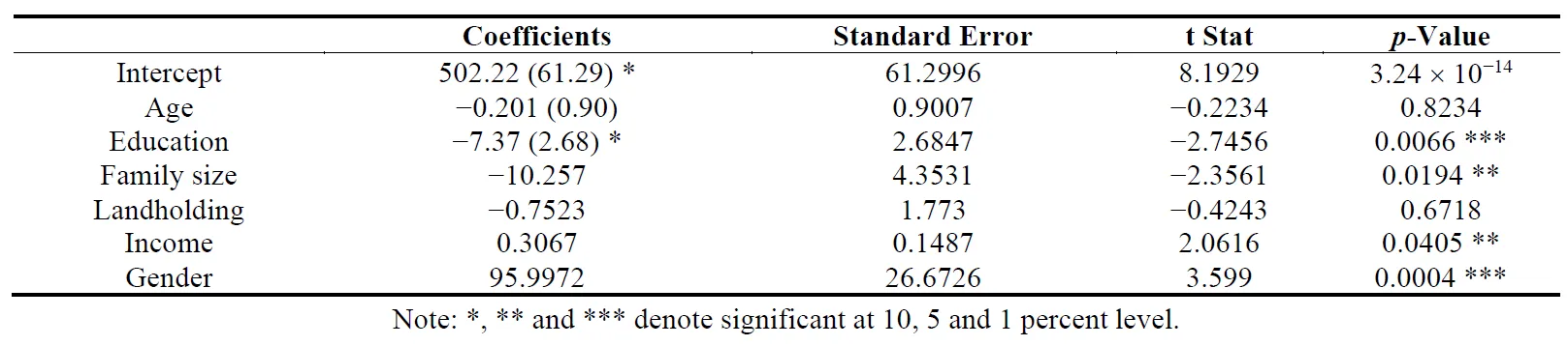 In order to understand the relationship between WTP and various socio-economic variables, a multiple linear regression (MLR) equation was developed. The socio-economic variables chosen in the present study include gender, age, years of education, family size, landholding, annual household income. The equation of the multiple linear regression model is expressed as;