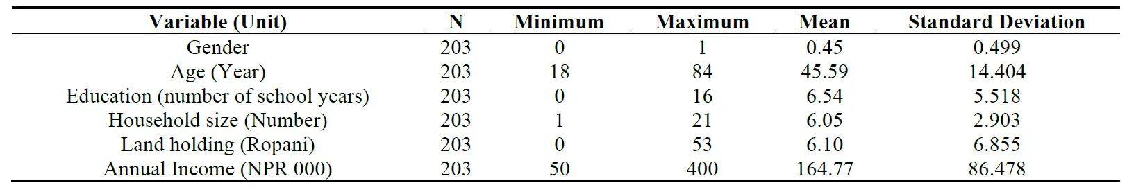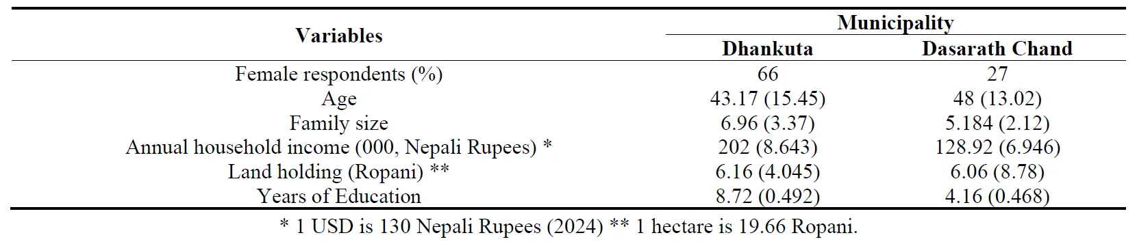 Out of 203 respondents interviewed, 93 were female respondents. Female respondent in Dhankuta is much higher than the Dasarath Chand municipality which may be because of the workload of women, cultural limitation (in case of Dasarath Chand municipality). The average age of the respondent is about 43 years in Dhankuta, and 48 years in Dasarath Chand municipality. The average land holding is Dhankuta is 6.16 Ropani whereas 6.06 Ropani in Dasarath Chand municipality ().